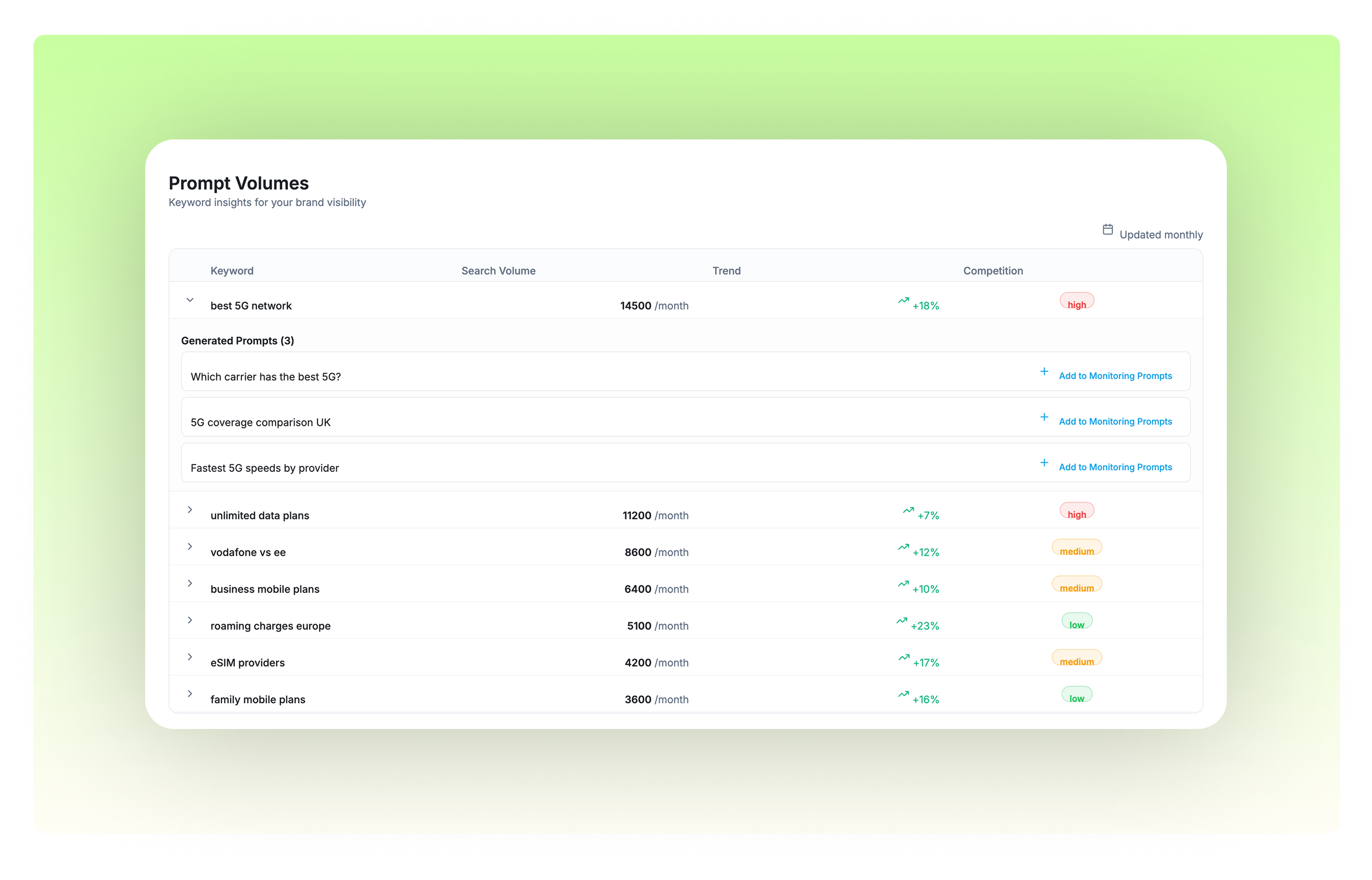 Get notified when mentions drop, competitors rise, or new questions trend.